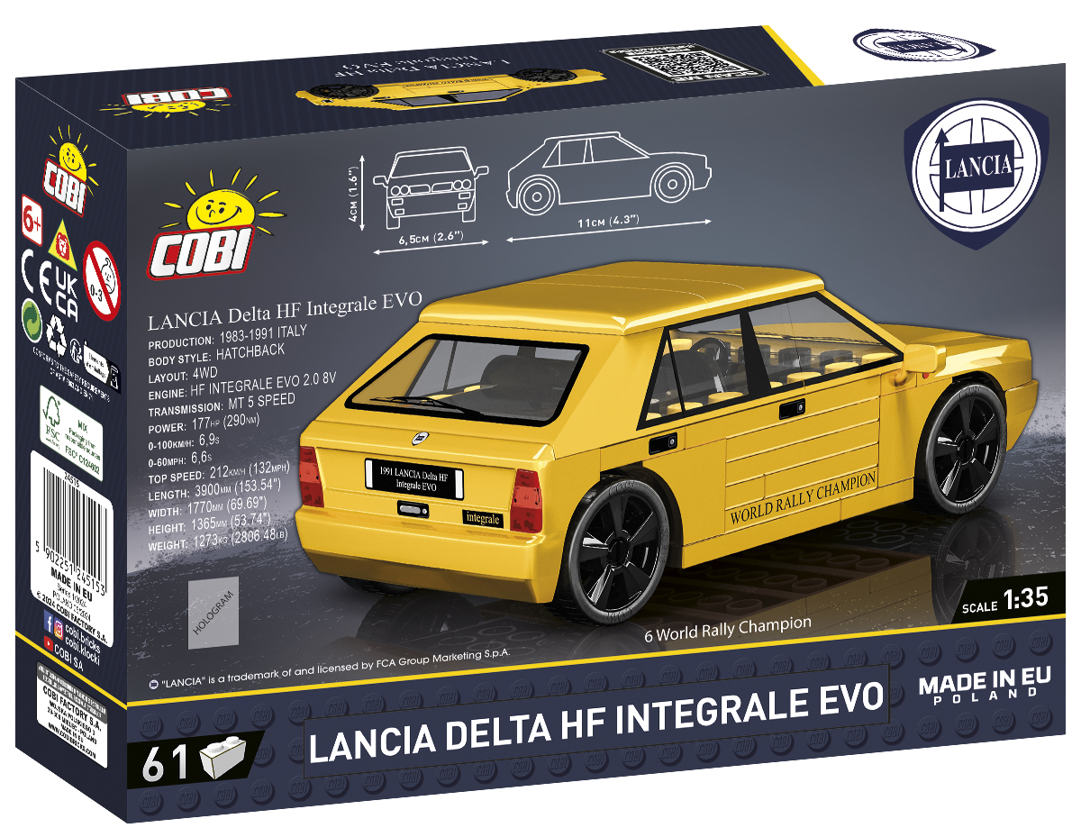 Ce modèle réduit complète parfaitement la collection de voitures contemporaines, youngtimers et de voitures anciennes conçues par COBI à l‘échelle 1:35. La Lancia Delta HF Intégrale EVO 1991 est une excellente idée cadeau pour les passionnés d’automobile, les collectionneurs, ainsi que pour les enfants intéressés par l’automobile et la technologie. Grâce à des instructions claires et précises, les voitures sont faciles à construire. C’est le set parfait pour commencer votre aventure avec les briques de construction polonaises COBI !