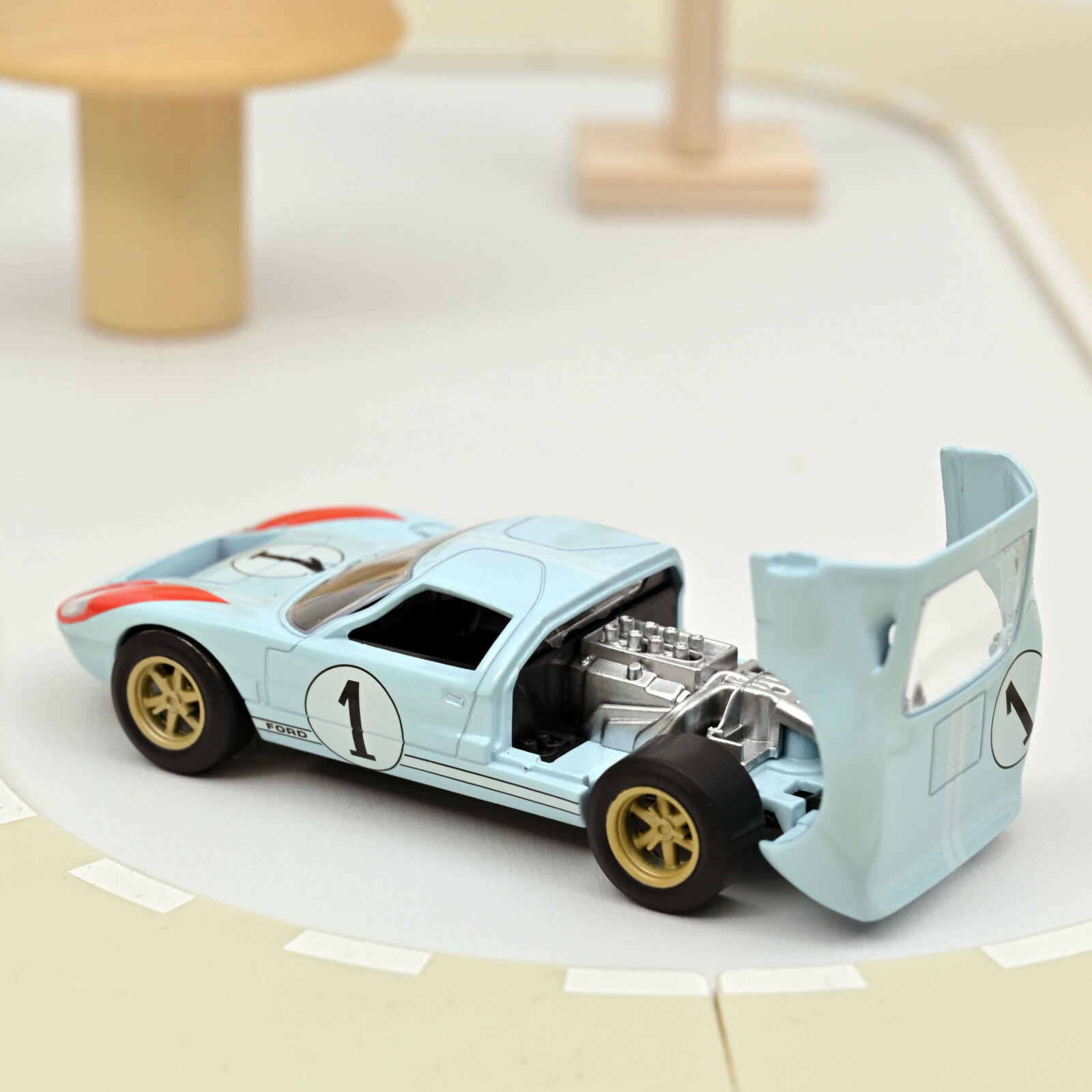 L’exemplaire proposé ici représente la voiture pilotée aux 24H du Mans 1966 par le duo de pilotes Ken Miles et Denny Hulme. Ils termineront deuxième, derrière la n°2 pilotée par Chris Amon et Bruce McLaren. L’attribution de la victoire à la n°2 a fait l’objet d’une petit polémique. Pour en savoir plus, on vous recommande vivement le film « Le Mans 66 » (Réalisé par James Mangold – Sortie: 2019 – Matt Damon joue le rôle de Carroll Shelby tandis que Christian Bale interprète Ken Miles).