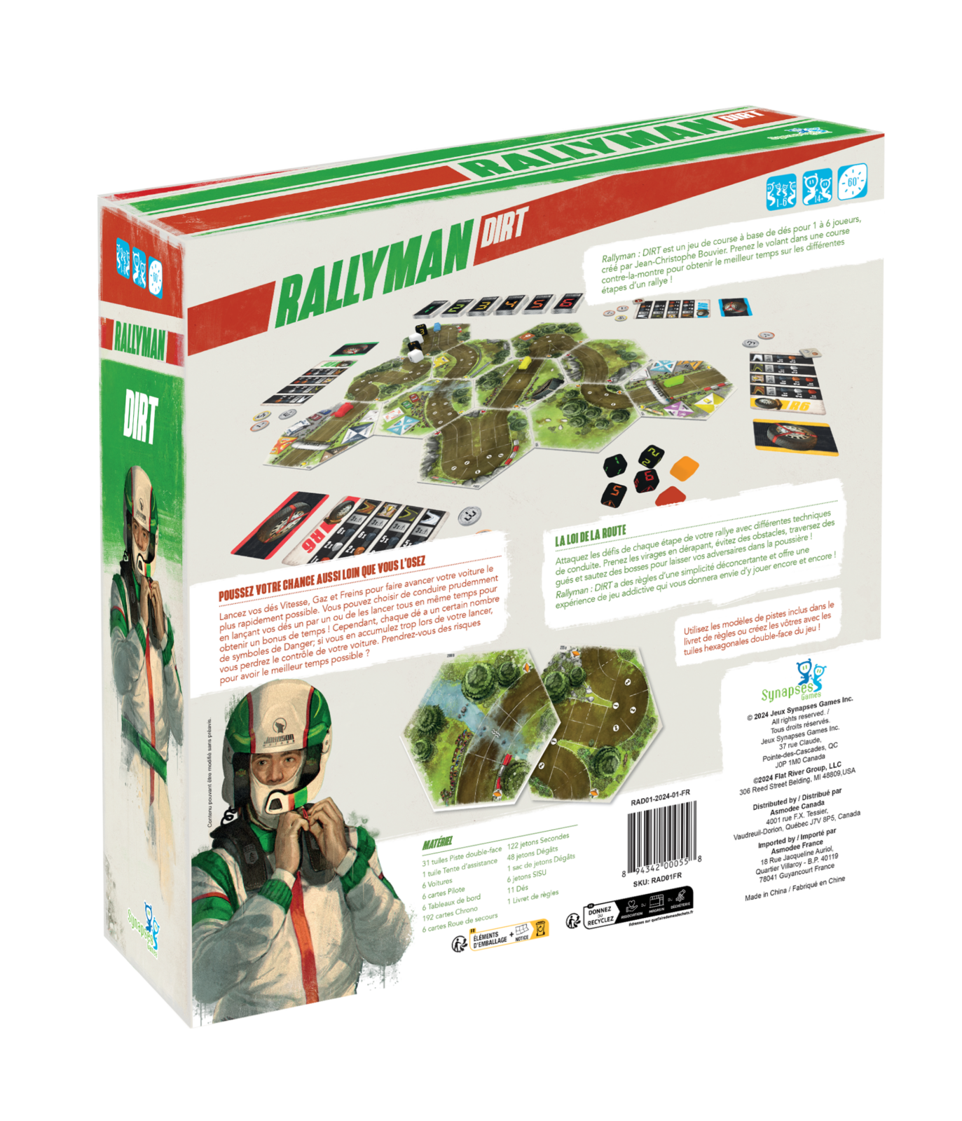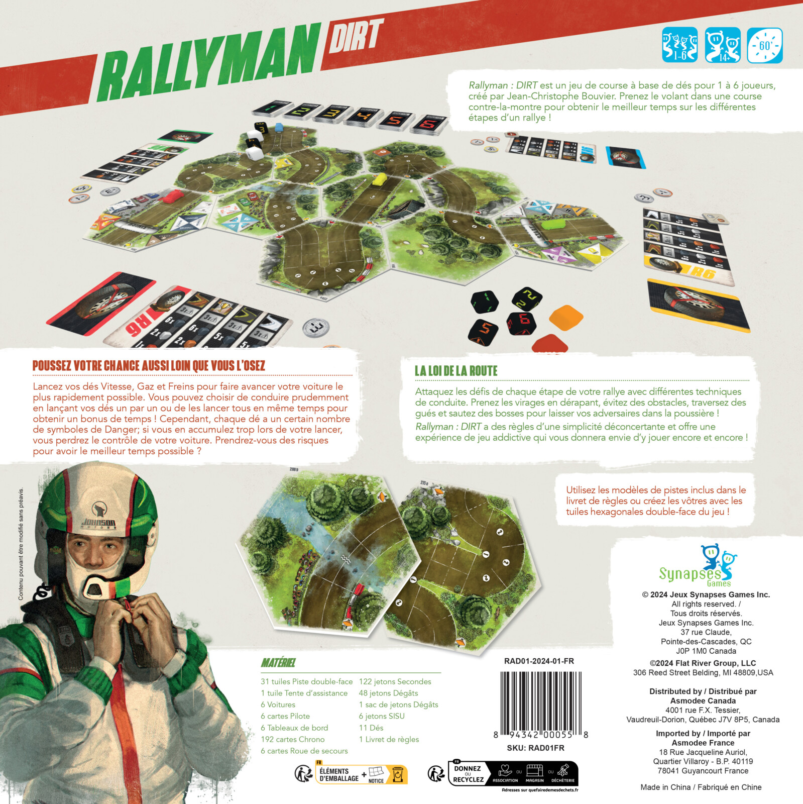 Rallyman DIRT est un jeu de rallye à base de dés pour 1 à 6 joueurs. Les joueurs endossent le rôle de pilotes de rallye qui s’affrontent pour obtenir le meilleur temps sur les différentes étapes d’un parcours. Les règles de Rallyman DIRT sont faciles à apprendre, mais offrent une expérience stratégique profonde.