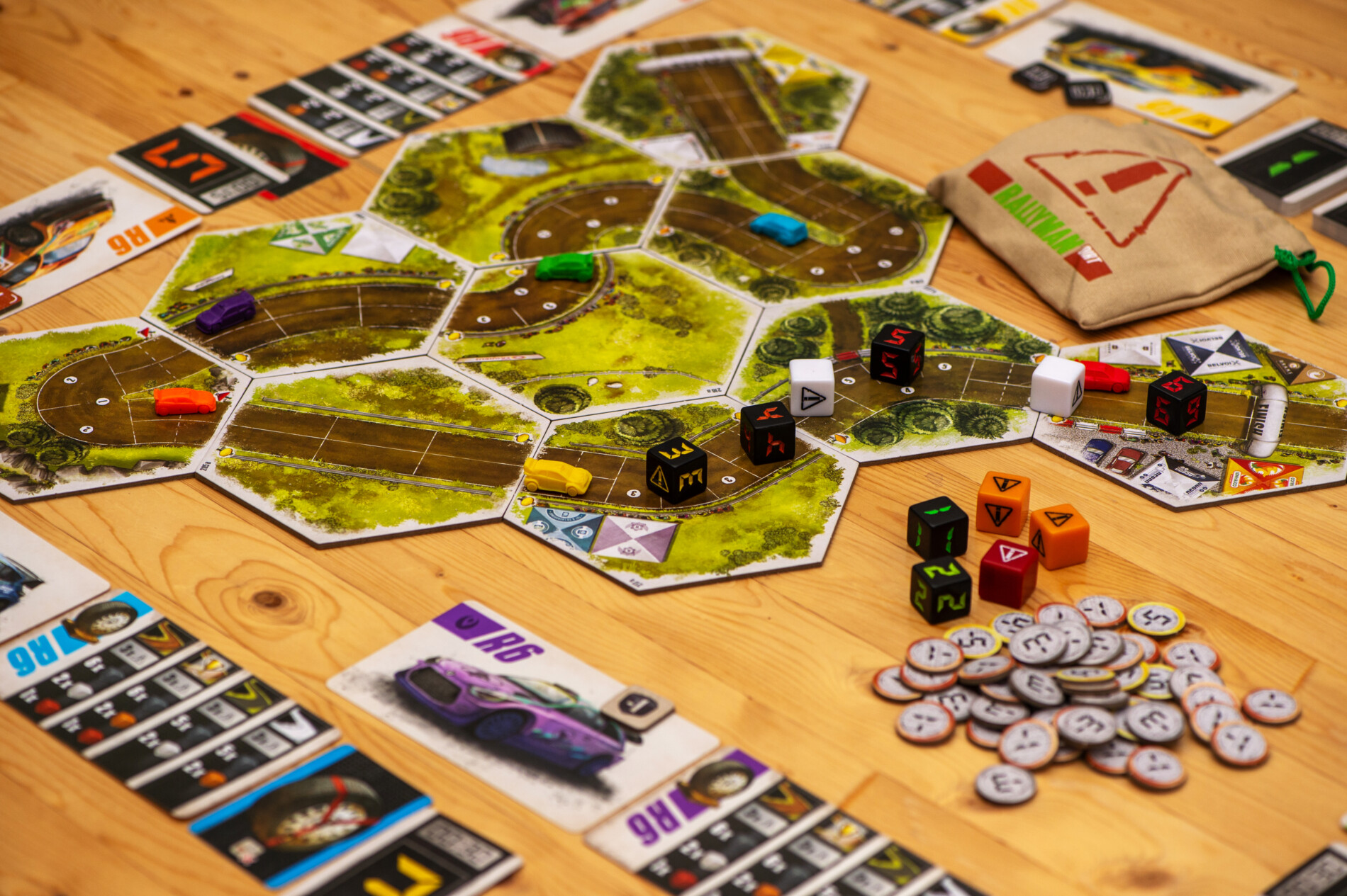 Contenu : 31 tuiles Circuit double-face, 1 tuile tente d’assistance, 6 voitures, 6 cartes pilote, 6 tableaux de bord, 192 cartes chrono, 6 cartes roue de secours, 122 jetons secondes, 48 jetons dégâts, 1 sac jetons dégâts, 6 jetons SISU, 11 dés, , 1 livret de règles.