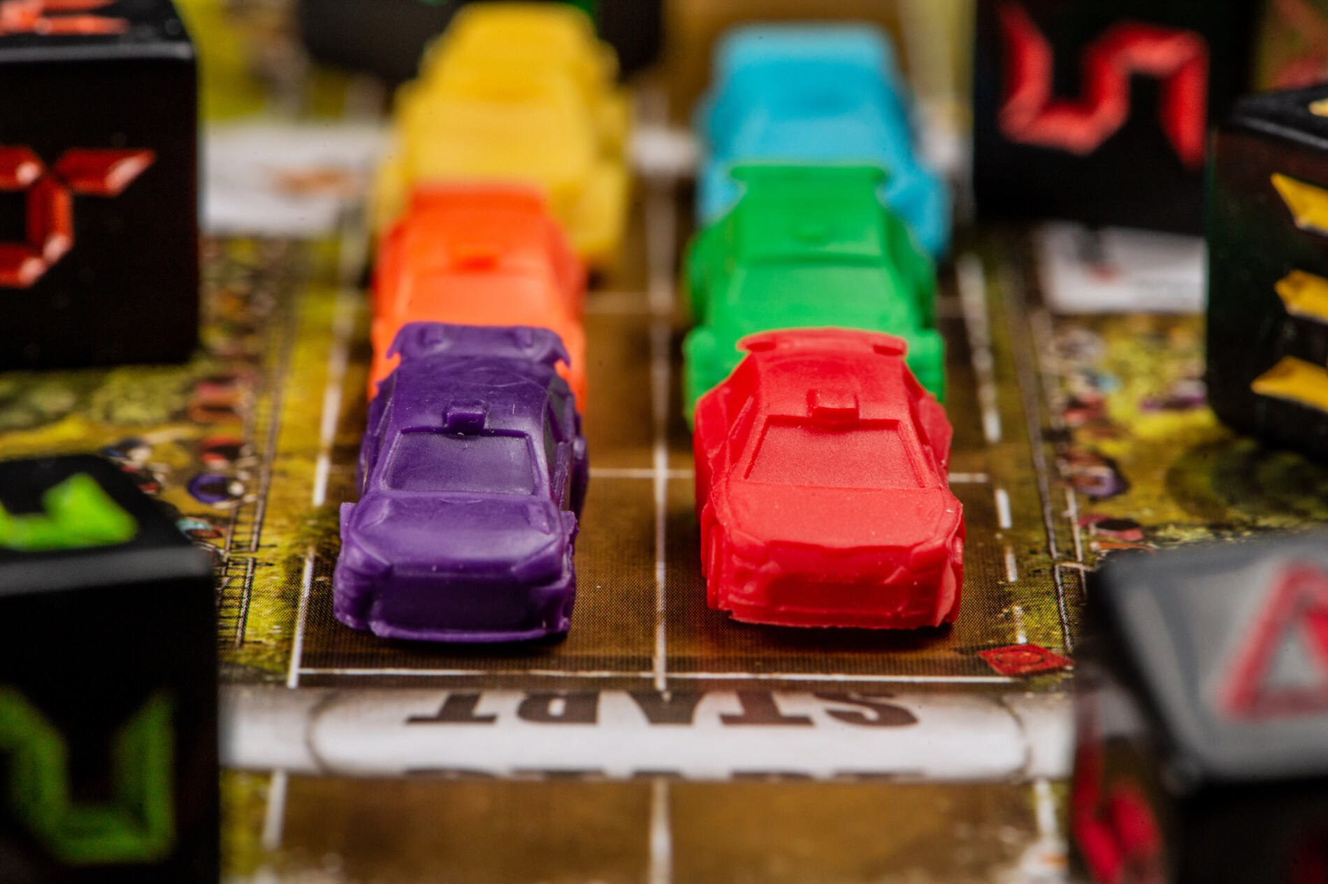 Rallyman DIRT est un jeu de course à base de dés, donc pour vous déplacer sur la piste, il faut les lancer. Chaque joueur utilisera un mélange de dés Vitesse, Freins et Gaz pour faire avancer sa voiture le long de la piste et chaque dé ne peut être lancé qu’une fois par tour. Elle comporte chacune un certain nombre de symboles Danger. Si vous en obtenez 3 en un seul lancer, vous perdez le contrôle de votre voiture, ce qui augmente votre temps et peut entraîner des dégâts.