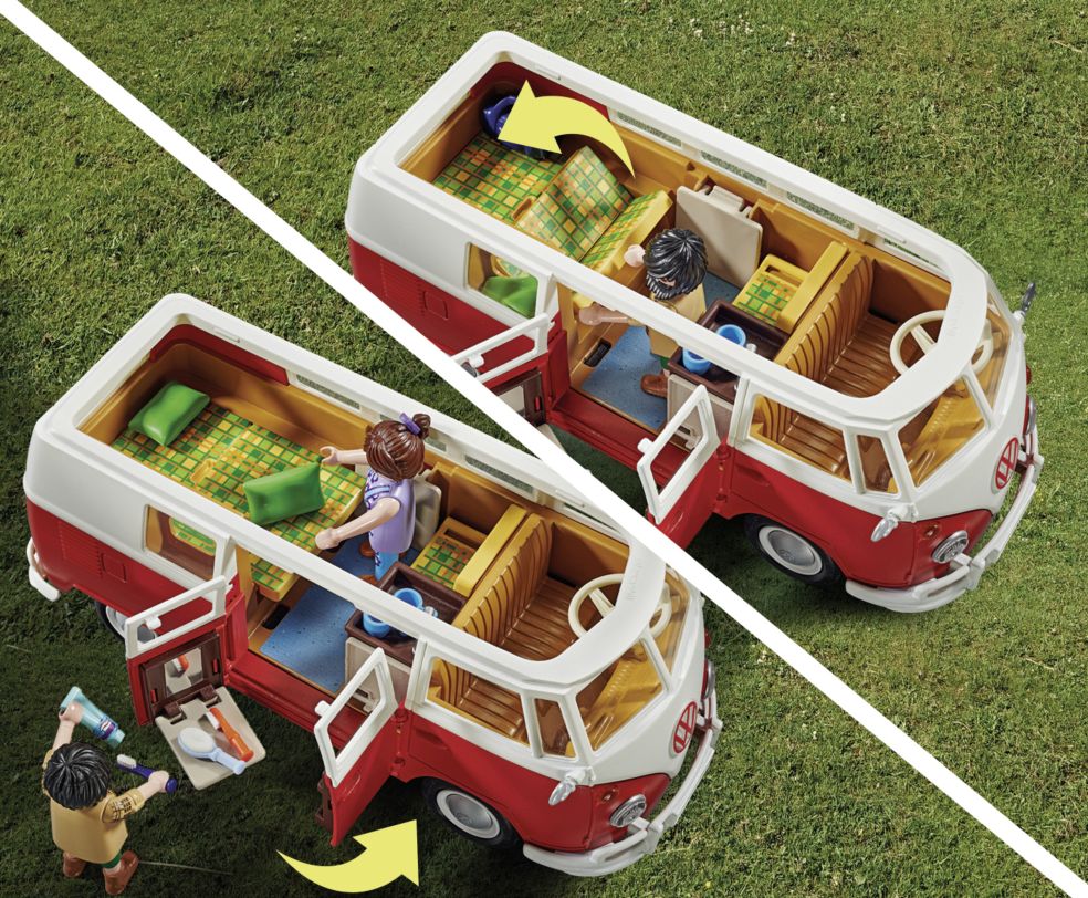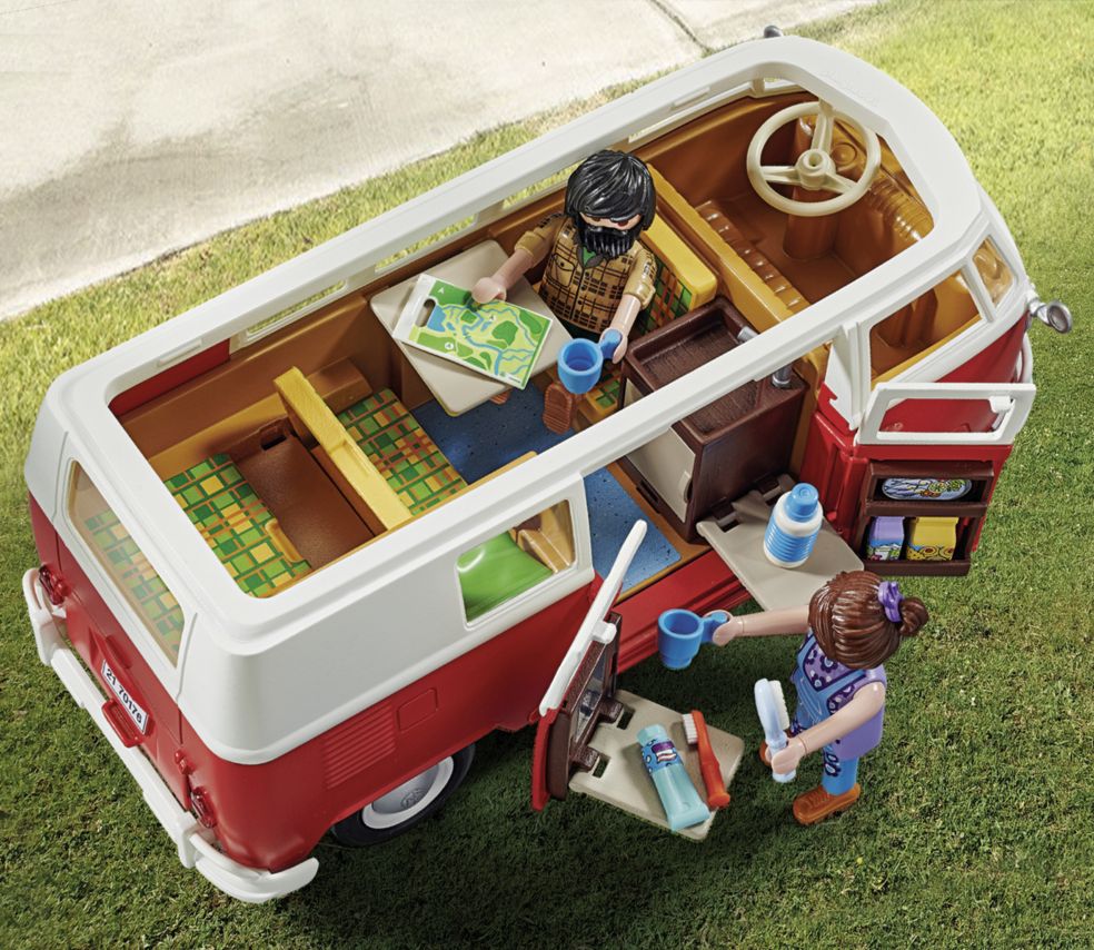 Le Volkswagen T1 est une icône de la route ! Adoré par des générations, d’innombrables aventuriers ont parcouru le monde dans ce camping-car. Bien sûr, la version PLAYMOBIL possède tous les détails qui en ont fait la légende qu’elle est aujourd’hui comme la séparation des couleurs en forme de V et logo VW rouge à l’avant, le toit arrondi, le pare-brise scindé et galerie de toit amovible. Les banquettes avec le motif à carreaux typique des années 60 peuvent être converties en un espace de couchage pour deux personnes. Les portes latérales peuvent être ouvertes, Bonne route !Contient deux personnages et des accessoires.«